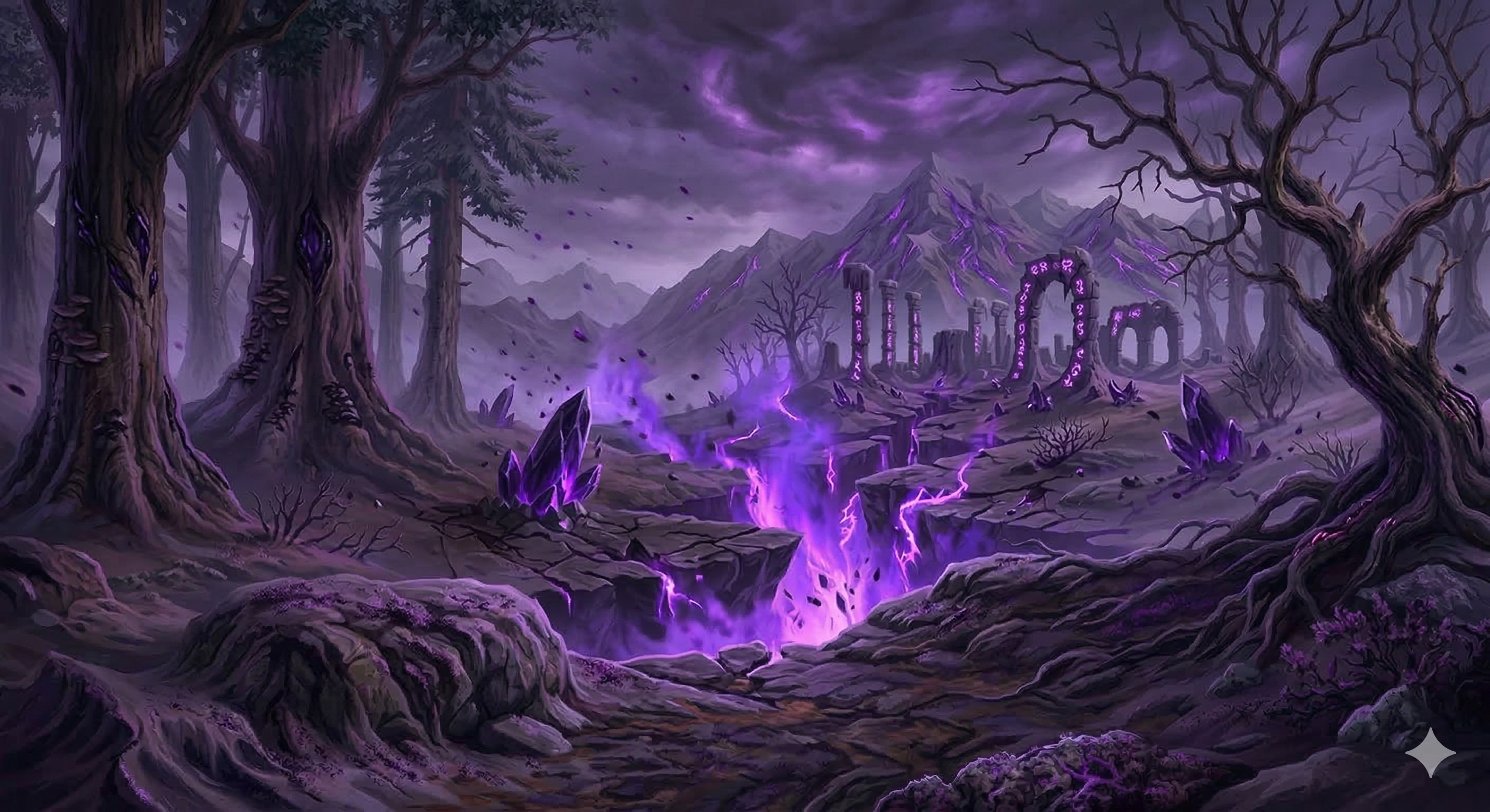 O epicentro da corrupção; um planalto fraturado com fendas roxas e energia instável que distorce a própria realidade.