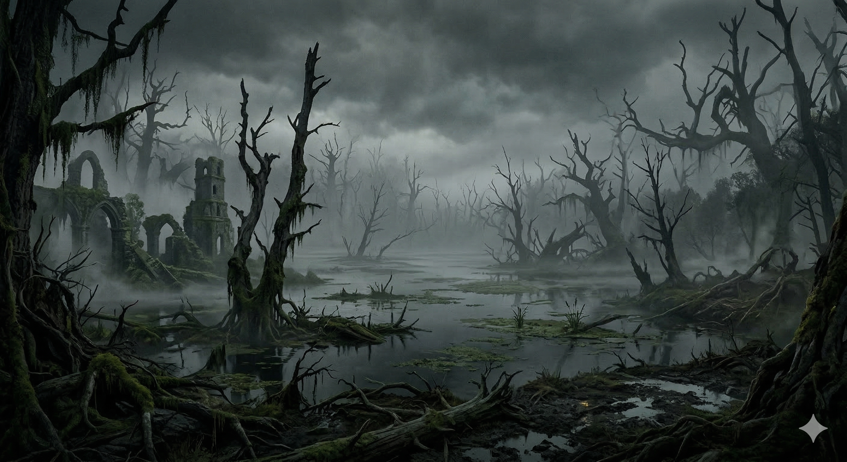 Um pântano fétido de águas negras e névoa perpétua, onde a vida estagnou e o perigo espreita em cada sombra retorcida.