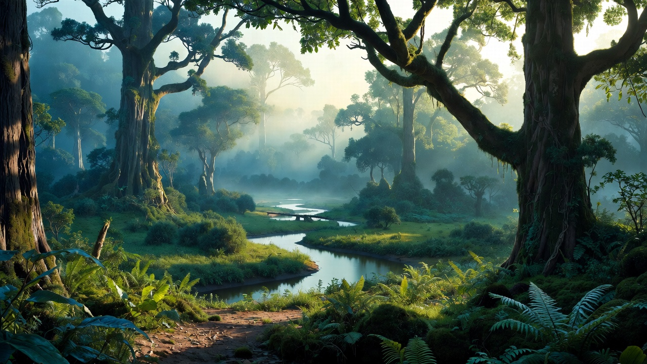 Uma selva vertical de árvores titânicas e cachoeiras colossais, pulsando com uma vida selvagem, úmida e ancestral.